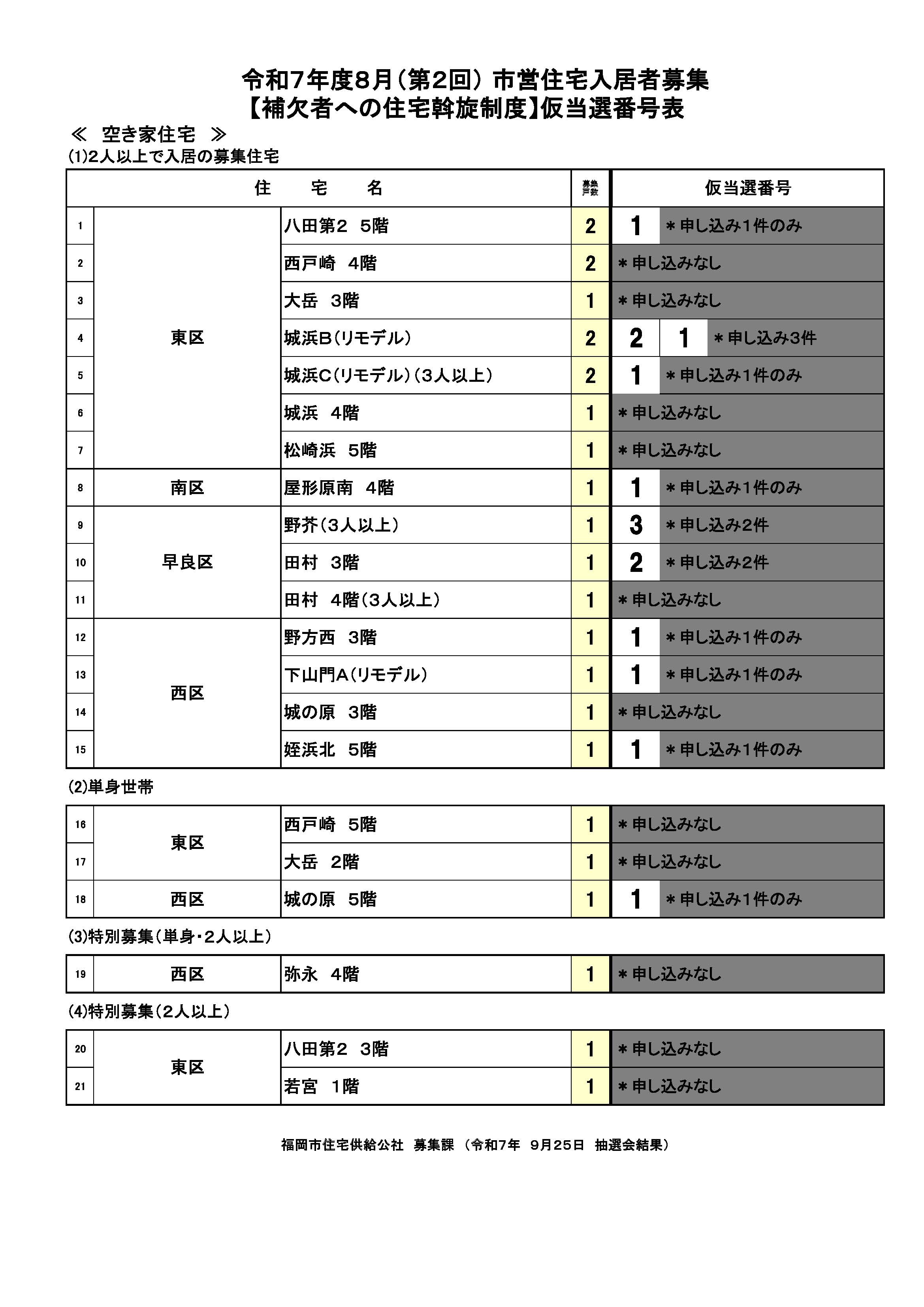 令和7年度8月募集≪補欠斡旋制度≫の抽選結果について 令和7年9月25日(木)に行った抽選結果です。 ・抽選結果 (PDFファイル) ※PDFファイルが見られない場合はこちら ・抽選結果 (JPEGファイル) 戻る
